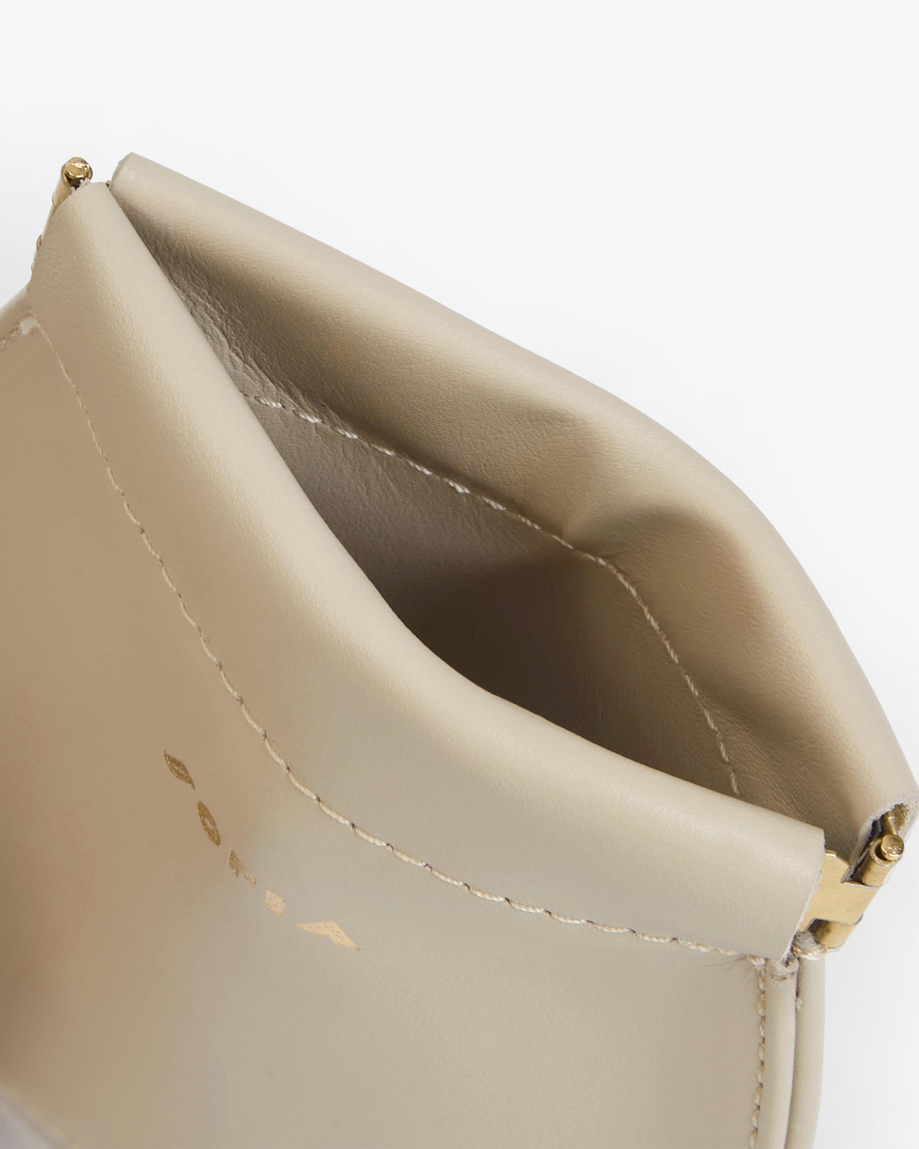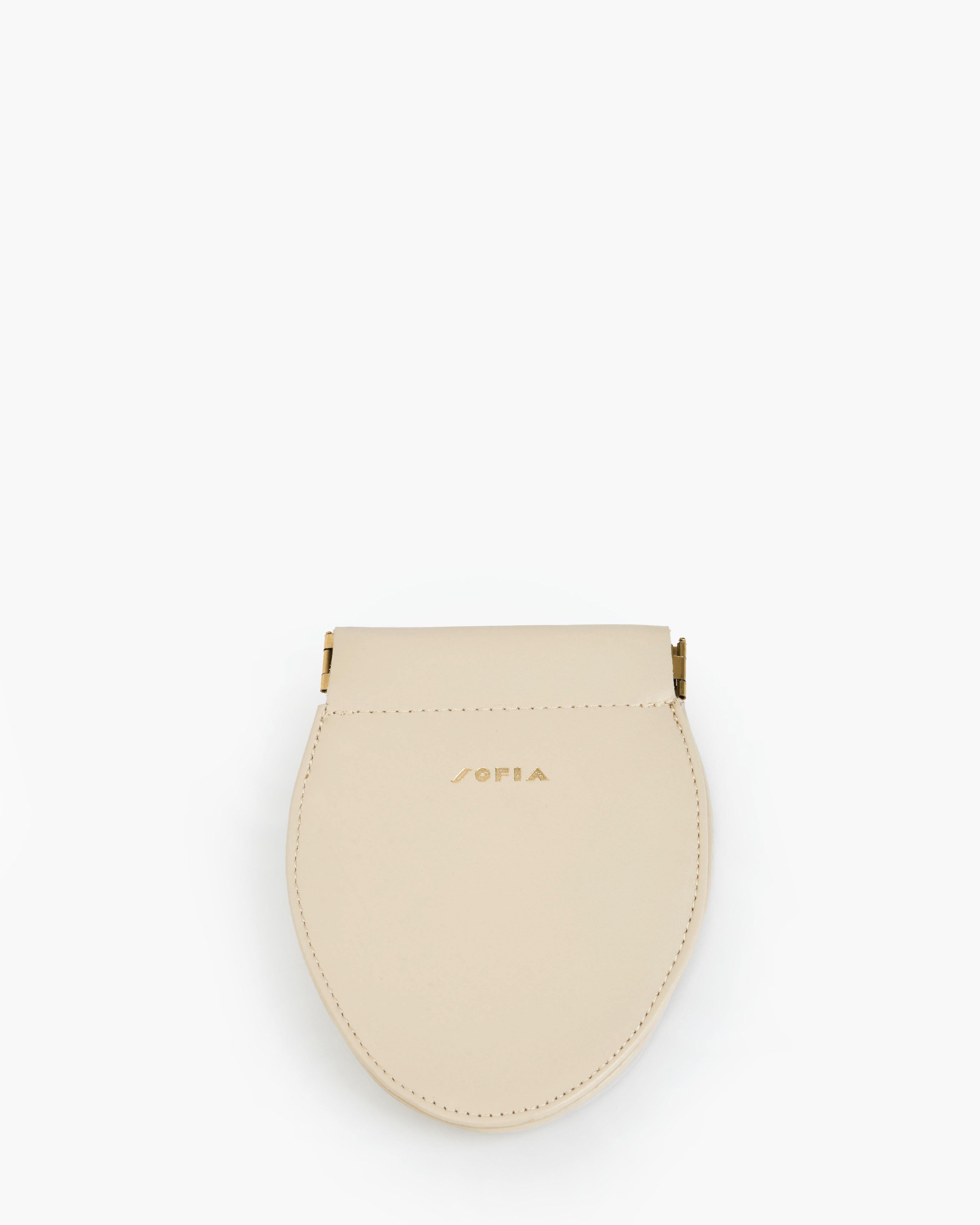 Portamonete bidimensionale con chiusura metallica rigida a scatto.
