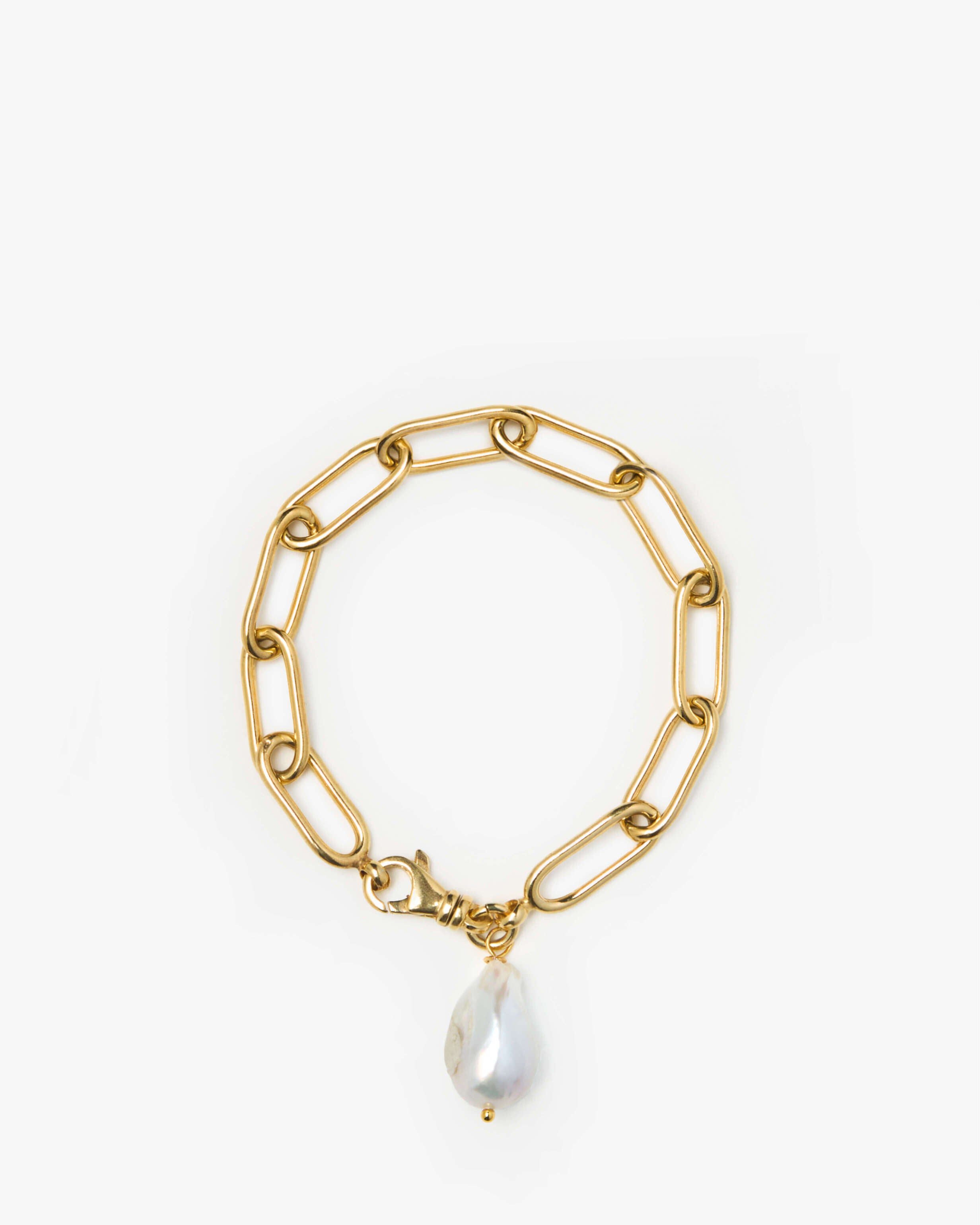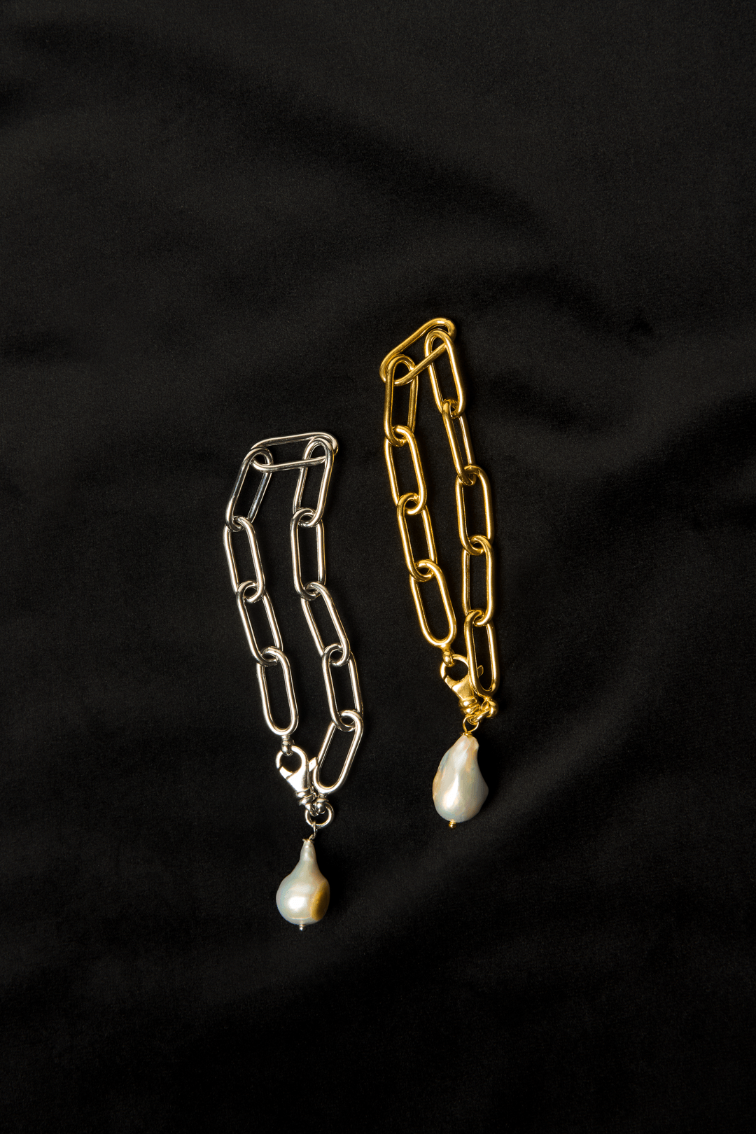 Il bracciale PAT nella variante Oro è realizzato in argento con finitura bagnata in oro. La catena è a maglia ovale aperta, con chiusura a moschettone. Il pendente è una perla freshwater naturale coltivata in acqua dolce. Ogni esemplare è unico: lievi variazioni di forma e colore della perla sono da considerarsi caratteristiche intrinseche del prodotto e non difetti.
