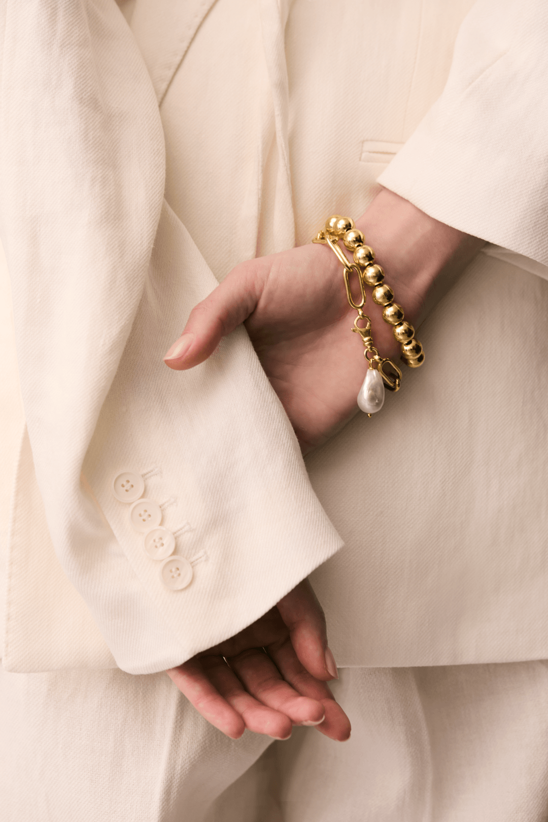 PAT è il braccialetto per chi ama il contrasto tra struttura e delicatezza. Una catena a maglia ovale dal design deciso, rifinita con un bagno in oro 12 carati, si chiude con un moschettone robusto ed elegante, da cui scende libera una perla freshwater naturale — il tocco che trasforma un gioiello forte in qualcosa di inaspettatamente poetico.